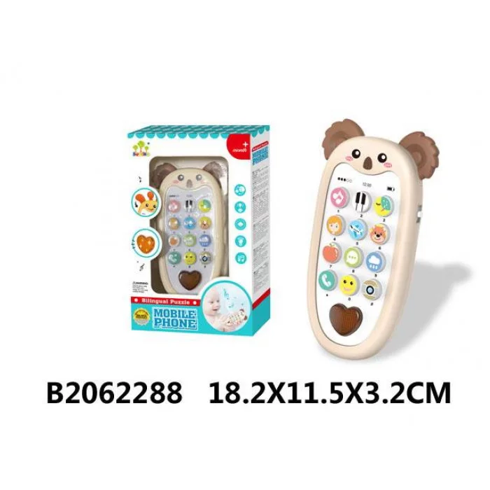 Развивающая игрушка "Телефончик", световые эффекты, звуковые эффекты: телефонный звонок, эмоции ребенка, снимок на фотоаппарат, название фруктов (на англ), погода (на англ), "мама", "папа", "бабушка", "дедушка" (на англ), животные (на англ), транспорт (на англ), мелодии без слов, песенки (на англ), в/к 11,5*3,2*18,2 см
