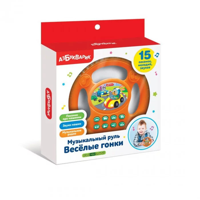 Отличный подарок для маленьких непосед! С этим рулем ребенок почувствует себя настоящим водителем! Нажимая на кнопочки, малыш сможет завести мотор, посигналить, включить сигналы поворота, послушать 4 песенки про машинки и музыкальное радио – 3 забавные мелодии. Весёлые гонки начинаются!