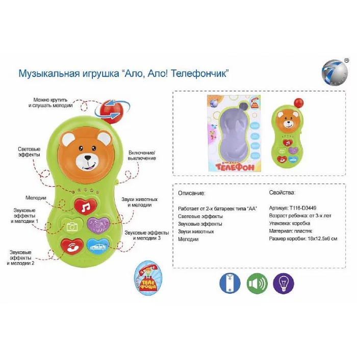 Телефон развив. на бат. звуки животных, звуковые (на русском языке) и свет. эффекты в/к 18*12, 5*6 см T116-D3449