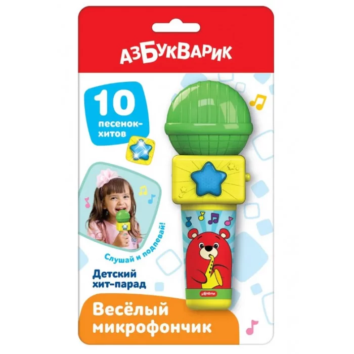 Стильный игрушечный микрофончик «Детский хит-парад» так похож на микрофон профессионального артиста! Но главное – с его помощью можно прослушать и спеть 10 детских хитов («Зарядка», «Лето», «Медвежонок – лучший друг», «Жил да был весёлый ёжик», «Каравай», «Барбарики (Что такое доброта?)», «Бум-Бум», «Чуку-чу», «Все зверята любят петь», «Калинка»). Нужно просто нажимать на кнопочку-звездочку! Во время звучания песен кнопочка светится. Караоке-шоу начинается!