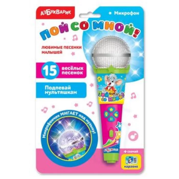 Этот микрофончик светится под музыку, а на каждой его кнопочке записано 5 весёлых песенок, включая «Песню Львёнка и Черепахи», «Танец утят», «По дороге с облаками», «Песенку о лете» и другие!
