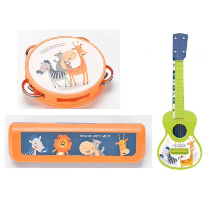 Перед вами – великолепный набор музыкальных инструментов, с помощью которого ребенок будет развивать свои творческие и музыкальные способности. Изготавливается из экологически чистых материалов. В комплекте: бубен, гитара, губная гармошка. В пакете.