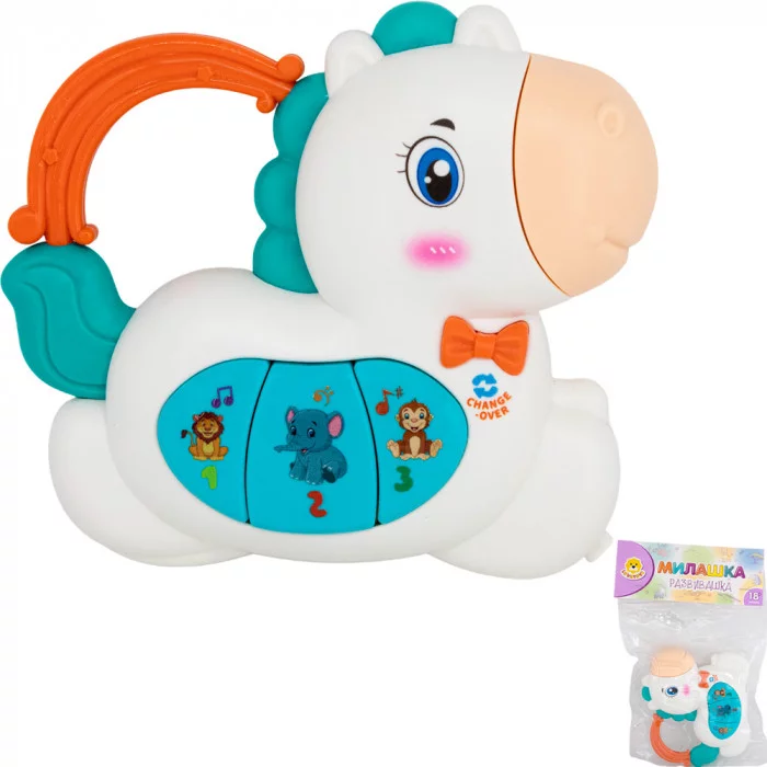 Погремушка выполнена в виде забавной лошадки. На игрушке расположены яркие кнопочки. Малыши с интересом будут их нажимать и слушать веселые мелодии. Игрушка выполнена из безопасного, качественного пластика.