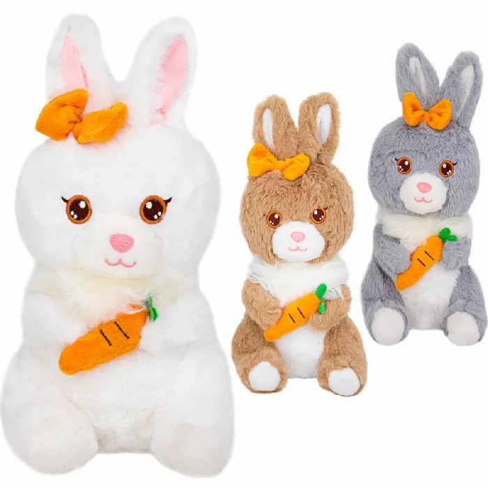 Зайчик очень добрый. Он ждет, когда его позовут играть. У него забавная мордочка, на голове очаровательный бантик и мягкая шерстка. В руках аппетитная морковка.
