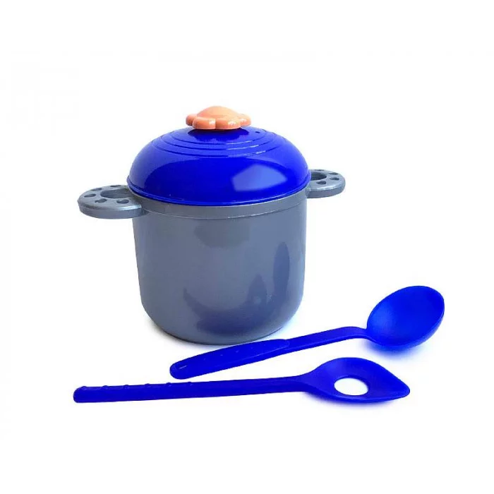 Набор детской посуды включает в себя 4 предмета: кастрюлю с крышкой, половник и ложку-шумовку. Посуда изготовлена из качественного прочного пластика.