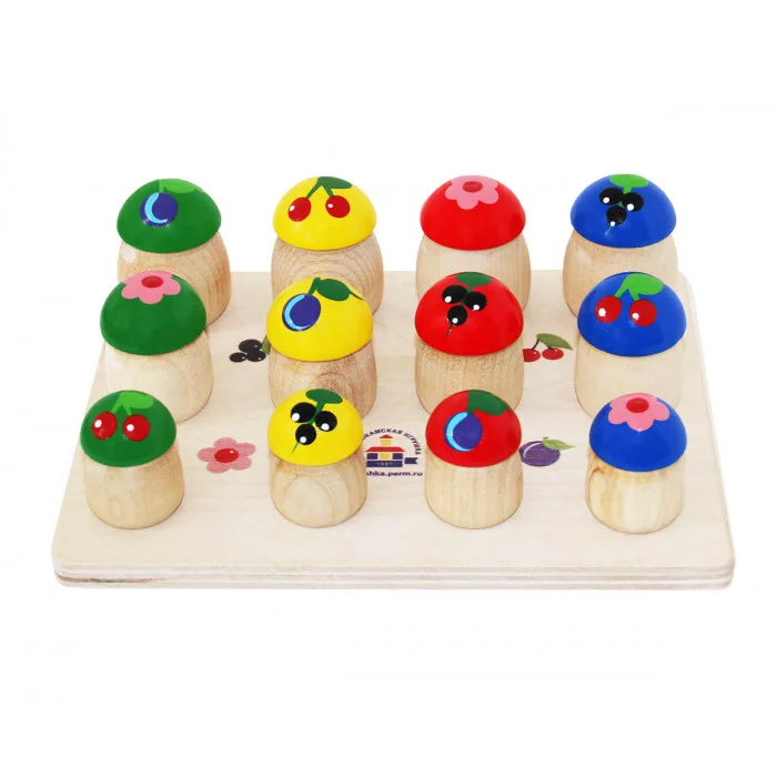 В картонную коробку с цветной картинкой входит 12 деревянныхрибов разного размера и с разным цветом шляпки. Они расположены на деревянном планшете, по 3рибочка разного размера в одном ряду, всего 4 ряда. Представлены цвета: синий, красный, желтый, зеленый. Набор подойдет для классификации по размеру, цвету, а также для сюжетно-ролевых игр.