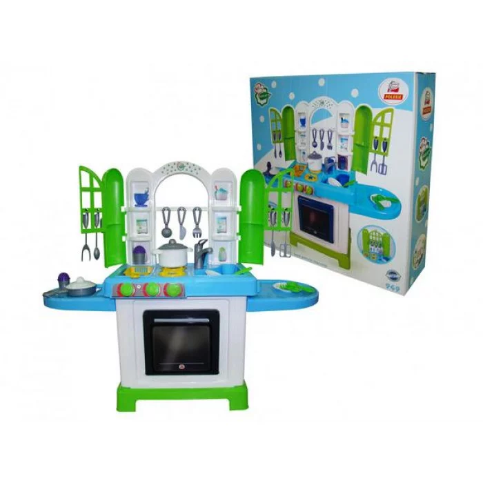 Набор оснащён несколькими зонами: зона для приготовления пищи, включающая фритюрницу, и зона для мытья посуды. На верхней панели комплекса располагается плита с конфорками, а под ней духовой шкаф.