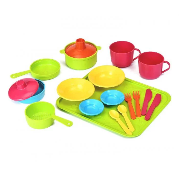 «Сели поели» - самый большой набор посуды серии Кухня, предназначенный для уютных обедов и ужинов большой семьи. С такой посудкой можно приготовить угощение и сервировать стол для своих домочадцев или любимых куколок и почувствовать себя настоящей радушной хозяйкой! В комплект входят: чайные пары и столовые приборы на 4 персоны, кастрюля и сковорода с крышками, сито, миска и яркий удобный поднос.