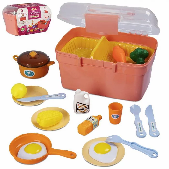 В комплекте: вилка, кастрюля, ложка, нож, нож зубьями, сковорода, тарелки – 3 шт, стакан, продукты – 8 шт.