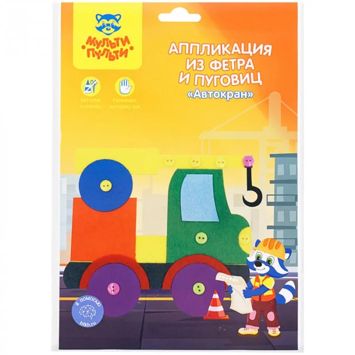 Аппликация из фетра и пуговиц «Мульти-Пульти» «Автокран» – прекрасное средство развития воображения, аккуратности и терпения у ребенка, а также мелкой моторики, внимания и мышления. С её помощью можно создать доступную и интересную поделку и провести время с пользой. Она предназначена для детей старше трёх лет. Все элементы на самоклеящейся основе, поэтому дополнительно не понадобится ни клей, ни ножницы! В наборе предусмотрены: цветная картонная основа, самоклеящиеся фетр, пуговицы и глазки, картонная подставка. Аппликация станет отличным дополнением детской комнаты, её также можно подарить в качестве подарка. Вид товара: набор для аппликации; Тип аппликации: аппликация из фетра и пуговиц; Размер: 19*22 см; Материал для аппликации: пуговицы, фетр, стразы, EVA; основа: картон; Пол: универсальный; Возраст: от 3 лет.