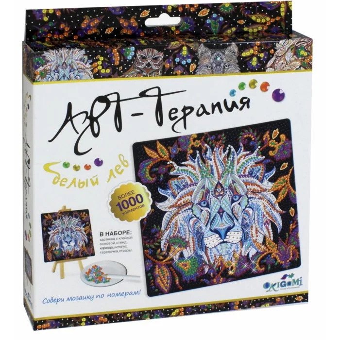 Коллекция алмазных узоров «Арт-Терапия» погружает в мир фэнтези. Выкладывайте алмазами Белого Льва, Золотую Сову, Ночного волка, Огненного Льва. Создавайте панораму из 4 картин. Оригинальное украшение интерьера. Алмазные картины сравнительно просты в изготовлении. Необходимо снять защитный слой с клеевой основы, и с помощью карандаша – стилуса приклеить стразы по номеру и цвету. Готовую картинку можно поставить на мольберт, который входит в набор.