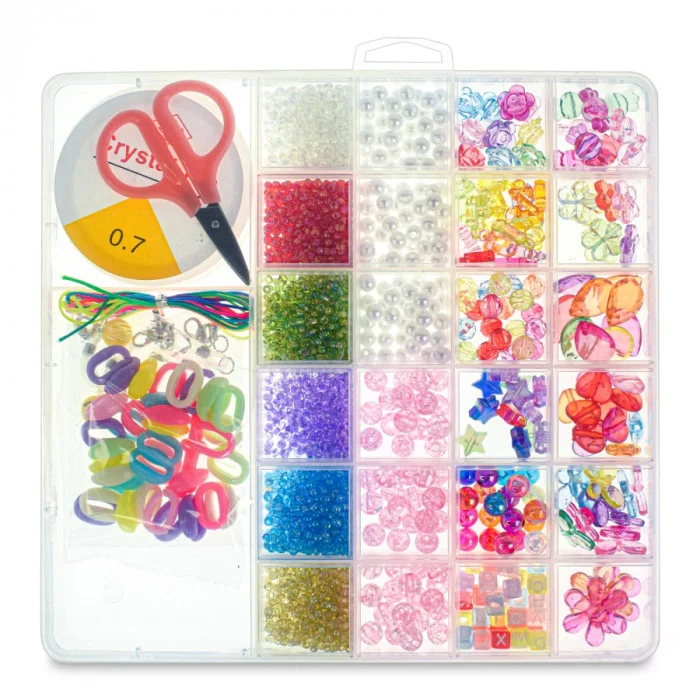 Комплектация: бусинки пластиковые для рукоделия разных размеров и форм, нить для плетения и ножницы.
