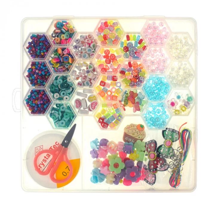 В комплект входит: бокс с четырьмя креплениями, 24 "соты" с бисером и бусинами разных цветов, форм и размеров, буквы английского алфавита, большие элементы в форме цветов, снежинок, сердечек и т.д., разноцветные нити и силиконовая эластичная нить для нанизывания, маленькие ножницы, метталические колечки, кулоны.