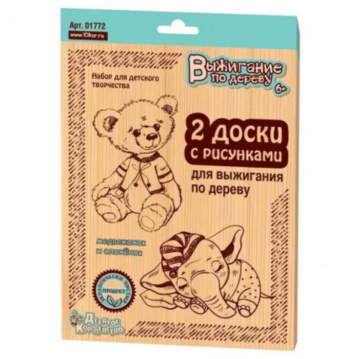 Размеры: 21*15*1 см Вес: 190 г. Возраст: от 7 лет и старше Картинки на досках Медвежонок и слоник многим напоминают любимые детские игрушки. Рисунки на досках из этого набора предназначены для тех, кто уже освоил технику выжигания. В наборе имеются 2 дощечки (фанерки) с изображениями медвежонка и слоника для выжигания размером 21 на 15 сантиметров, толщиной 4 мм. Они занимают мало места в портфеле ребенка, поэтому их удобно использовать в школе на уроках труда, посвященных выжиганию по дереву или просто для тех, кто увлечен пирографией.