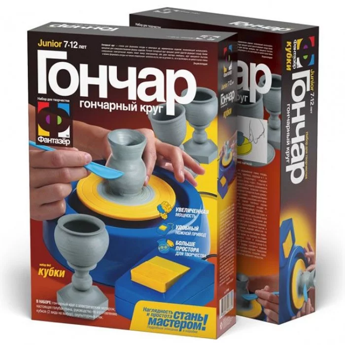 Комплект: гончарный круг, стек, глина, инструкция Материал/состав: пластик, глина Упаковка: картонная коробка Размер упаковки: 24,5*36*7,5 см Возраст: от 7 лет Страна обладатель бренда: Россия Набор для создания изделий из глины познакомит ребенка с процессом лепки при помощи гончарного круга и станет замечательным подарком. Для гармоничного развития ребенка важно заниматься творчеством, ведь оно не только формирует художественный вкус, но также и развивает творческие способности, внимание, воображение, мелкую моторику, цветовосприятие и усидчивость. Глина - замечательный материал для творчества, позволяющий реализовать самые смелые творческие замыслы. Это пластичный, послушный и приятный на ощупь материал. Из него ребенок сможет вылепить множество фигурок. Готовую поделку следует высушить, а затем можно расписать красками или покрыть глазурью. Гончарный круг оснащен моторчиком для вращения.