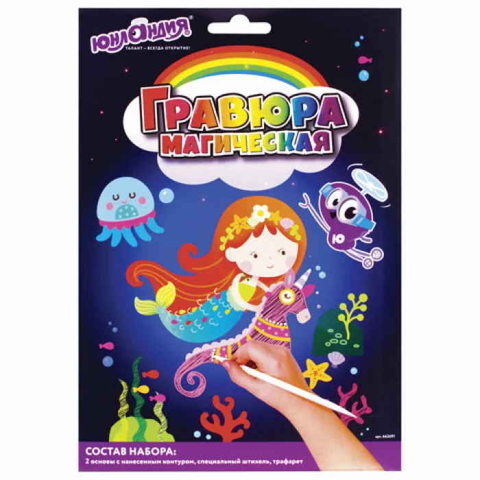 Магические гравюры ЮНЛАНДИЯ - это наборы из 2 цветных картинок-гравюр, предназначенные для детского творчества, подготовки детской руки к письму, развития координации и просто весёлого времяпровождения. В набор входят 2 разных картинки формата А5, специальный штихель для снятия тёмного верхнего слоя гравюры, а также трафарет. Набор упакован в красочный картонный конверт с европодвесом, содержащий инструкцию.Для создания цветной картинки необходимо снимать верхний слой гравюры, царапая палочкой по контуру рисунка или в свободном порядке. С помощью трафарета и штихеля можно добавить на гравюры красивые детали - сердца, звездочки, цветочки и другие формы.