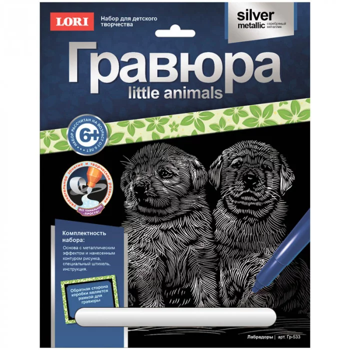 Комплект: основа с нанесенным контуром рисунка, специальный штихель, инструкция. Из чего сделана игрушка (состав): картон, пластик Упаковка: картонный конверт с подвесом Размер упаковки: 30*20*1 см Размер гравюры: 18*24 см Особенности: эффект серебра Возраст: от 6 лет Страна обладатель бренда: Россия Гравюра - особый вид графического искусства. Сцарапывая верхний слой гравюры специальным штихелем, входящим в набор, ребёнок может самостоятельно создать настоящее произведение искусства и почувствовать себя гравером. Готовую гравюру можно вставить в рамку. Набор по созданию оригинальной гравюры "Лабрадоры" приобщит ребенка в миру искусства. Оборот коробки является рамкой. Гравюра от российского производителя "Lori" обладает металлическим эффектом и серебристым цветом, она точно понравится маленьким художникам, ведь они смогут создать самостоятельно замечательный подарок или элемент декора. Гравюра требует усидчивости, внимания и терпения, ведь это кропотливый труд. Набор содержит все необходимое