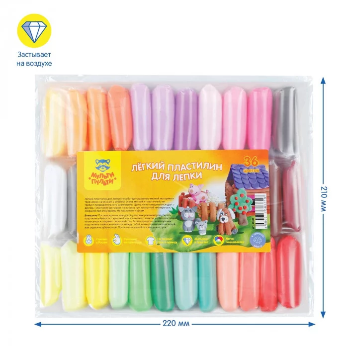 Воздушный (легкий) пластилин – это мягкий, очень пластичный и приятный материал, открывающий безграничные возможности в мир творчества. Лепка из легкого пластилина развивает мелкую моторику рук, фантазию и творческие способности. Пластилин очень мягкий, а цвета легко смешиваются между собой, создавая новые оттенки. Пластилин полностью высыхает на воздухе и сохраняет форму поделки. Чтобы неиспользованный пластилин не высох в состав набора входят пакетики с зип-локом, в которые можно убирать неиспользованный пластилин. Набор легкого пластилина Мульти-Пульти состоит из 36 цветов по 10 грамм. Пластилин не пачкает руки, одежду и мебель. Произведен и сертифицирован в России с использованием безопасных для здоровья детей красителей и компонентов.