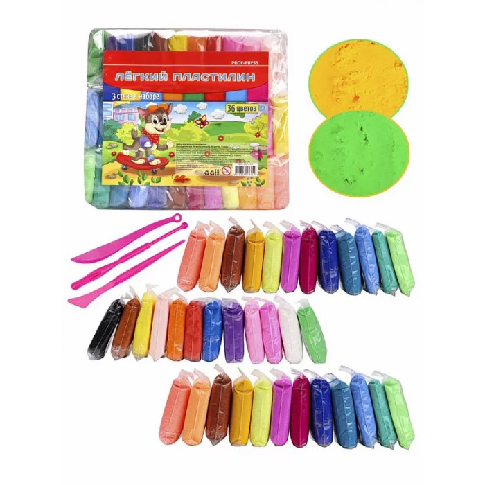 Лёгкий пластилин придётся по душе и детям, и взрослым! Он отличается от обычного пластилина не только весом, но и текстурой: масса легко лепится, а после высыхания на воздухе застывает, сохраняя форму. Разные цвета можно смешивать и в результате получать совершенно новые расцветки. При этом пластилин не пачкает мебель, не крошится, не деформируется и не тонет в воде. С готовыми фигурками можно спокойно играть, не боясь повредить поделки. 36 цветов, 3 стека в комплекте.