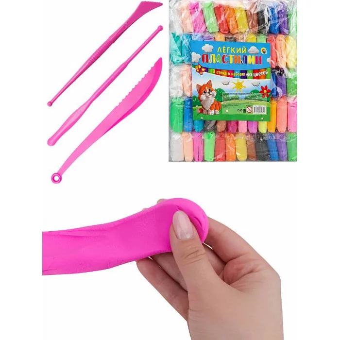 Легкий пластилин создан специально для детских пальчиков, поэтому он легко поддается лепке. Его особенность заключается в том, что после высыхания масса полностью застывает и сохраняет форму фигурки. Такой пластилин не пачкает одежду, руки и мебель, не крошится и не тонет в воде! Цвета можно смешивать между собой и создавать новые оттенки. Лепка из воздушного пластилина развивает мелкую моторику рук, координацию, фантазию и воображение. В наборе: 60 цветов, 3 стека. Упаковка: пакет.