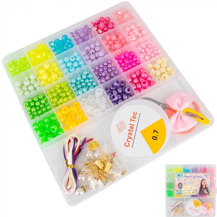 Комплектация: бусины (24 видов), подвески-украшения (4 видов), силиконовая нить-резинка (0.7), разноцветные нити, заколка с бантиком, мини ножницы, замочки для бижутерии