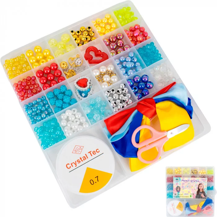 Комплектация: бусины (16 видов), подвески-украшения (8 видов), силиконовая нить-резинка (0.7), разноцветные нити, заколка с бантиком, мини ножницы