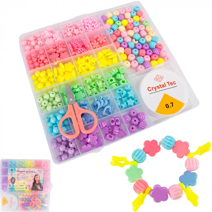 Комплектация: бусины разных форм и цветов (25 видов), мини-ножницы – 1 шт., моток лески (0,7 м) ¬– 1 шт., удобный пластиковый бокс для хранения – 1 шт.
