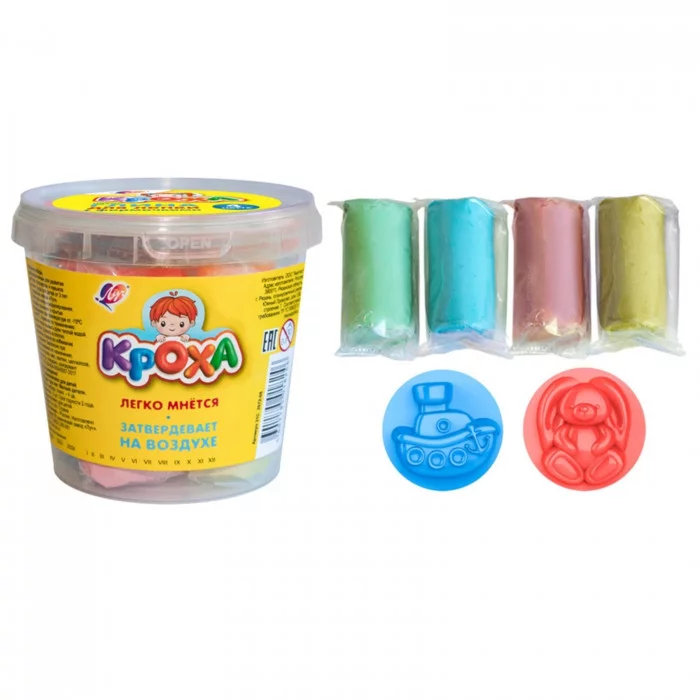 Набор с глиной для лепки предназначен для детей от 3-х лет. Материал пластичный, легко поддаётся лепке, поделки из этой глины затвердевают на воздухе без обжига. Готовую работу можно раскрашивать гуашевыми или акриловыми красками. При правильном хранении поделку можно хранить годами. Упаковка - пластмассовый стакан с крышкой. В наборе глина для лепки 4 цвета (жёлтый, зеленый, розовый, голубой) и 2 формочки.