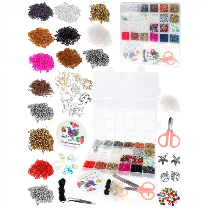 Комплектация: 22 ячейки с бисером разного цвета и размера, 4 подвески, 1 ножницы, 1 лескаи (диаметром 0,5 мм (13 м)), 1 пинцет, фурнитура: швензы (основа для сережек) - 30 шт., колечки - 50 шт., замочки - 20 шт.