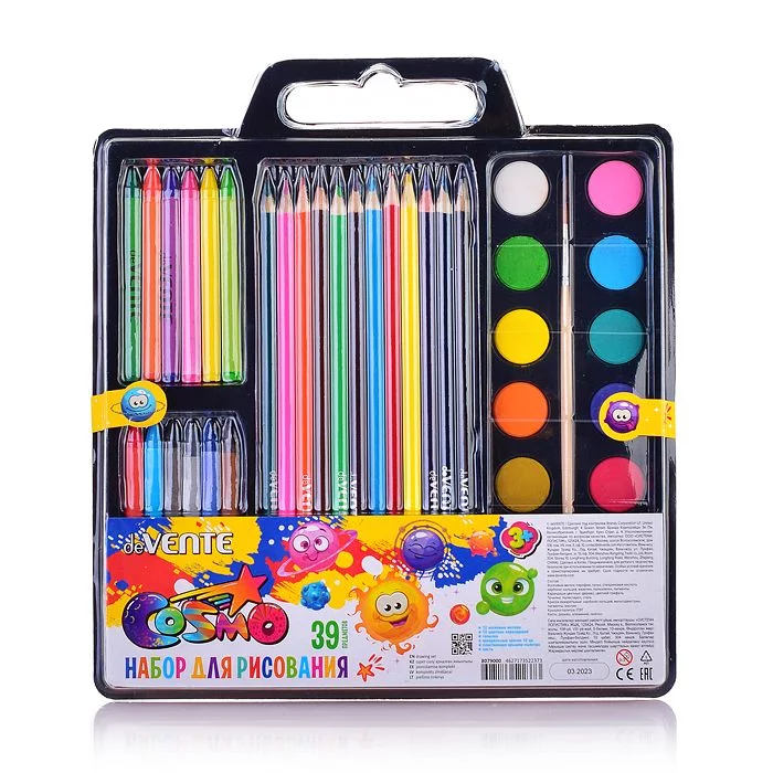 Набор для рисования подарочный "deVENTE. Cosmo" в наборе 39 пр: краски акварельные 12 цв, кисть, пластиковая крышка-палитра, карандаши цветные 12 цв, мелки восковые 12 цв, точилка, в пластиковой коробке с подвесом