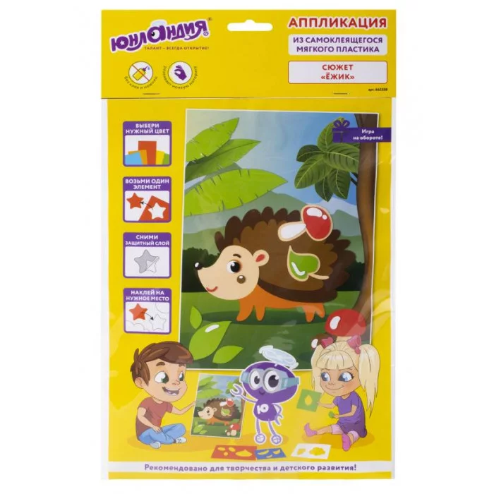В набор входит яркая картонная основа размером 21х29 см с напечатанным дизайном аппликации, разработанным дизайнерами ЮНЛАНДИЯ специально для детей, а также 8 листов мягкого пластика разных цветов. Элементы аппликации перфорированы и имеют клеевой слой, что позволяет создать аппликацию без клея и ножниц.