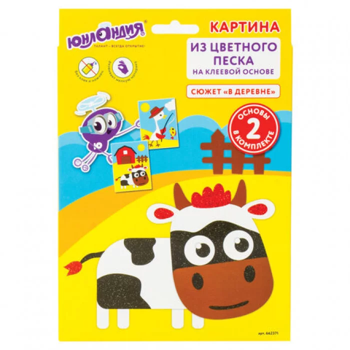Картина из цветного песка ЮНЛАНДИЯ - это интересный способ развития мелкой моторики, цветового восприятия и фантазии ребёнка, а также блестящая картина своими руками! Для создания аппликации не требуются ножницы и клей, всё необходимое входит в набор. В набор входят 2 самоклеящиеся картонные основы размером 20х15 см с напечатанным дизайном аппликации, разработанным дизайнерами Юнландия специально для детей, покрытые защитным слоем бумаги с перфорацией по линиям рисунка, а также 6 пакетиков-трубочек с цветным песком разных цветов.При помощи деревянной палочки, входящей в комплект, необходимо снять с элементов рисунка защитный слой бумаги и на показавшийся клеевой слой аккуратно насыпать цветной песок соответствующего цвета. Рекомендуется начинать с более тёмных оттенков и работать одновременно только с одним цветом песка.Набор упакован в красочную картонную коробку с европодвесом. На обратной стороне коробки вас ждёт сюрприз - фигурка Юнландика с подставкой. Покупая разные наборы, можно собрать целую коллекцию