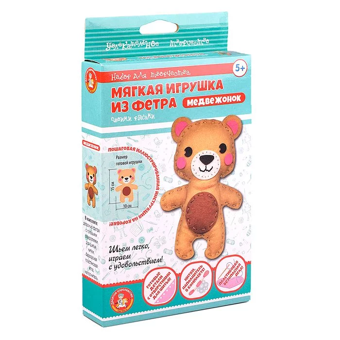 Размер упаковки: 21 х 12 х 3 см Вид упаковки: картонная коробка с подвесом Размер готовой игрушки: 15 х 10 см Страна производитель: Россия Материал: текстиль, холлофайбер, пластик Комплектация: готовые детали с отверстиями для шитья, нитки, наполнитель, пластиковая игла, пошаговая инструкция Вес: 27 гр. Возраст ребёнка: 5+ Набор для творчества «Мягкая игрушка из фетра. Медвежонок» от бренда «Десятое королевство» предназначен для детей старшего дошкольного возраста. С помощью данного набора дети смогут сшить замечательную мягкую игрушку в виде очаровательного медвежонка. В комплект входит пошаговая инструкция, что позволяет ребёнку самостоятельно справится с созданием поделки. В процессе создания игрушки ребёнок развивает творческие способности, образное мышление, моторику рук и воображение.