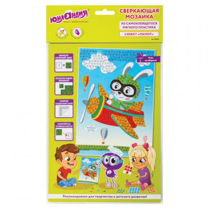 Сверкающая мозаика из мягкого пластика EVA ЮНЛАНДИЯ "Пилот" - это весёлый и занимательный способ развития мелкой моторики, аккуратности и цветового восприятия ребёнка. Все элементы в составе самоклеящиеся, для работы не требуются ножницы и клей. В набор входит яркая картонная основа размером 21х29 см с напечатанным дизайном аппликации, а также 5 листов мягкого пластика разных цветов с голографическим эффектом. Белыми пронумерованными квадратиками на картинке обозначены места, куда необходимо приклеить элементы соответствующего цвета. Схема соответствия номеров и цветов расположена на бумажном вкладыше.Сюжеты разработаны дизайнерами ЮНЛАНДИЯ специально для детей. Квадратные элементы аппликации перфорированы и имеют клеевой слой, что позволяет создать аппликацию без клея и ножниц. Набор упакован в полипропиленовый пакет с картонным европодвесом. Внутри каждого набора подарок-игра: весёлые лабиринты и другие занимательные задания от Юнландика!