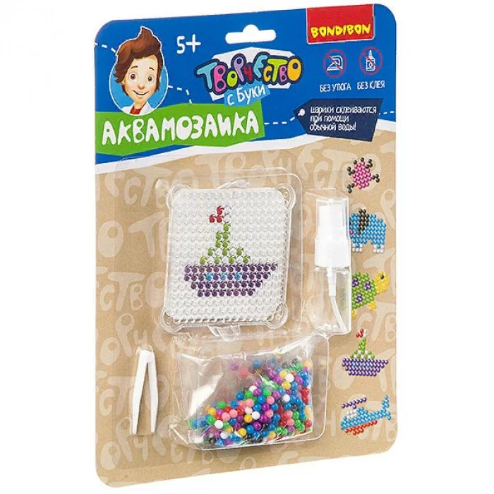 Попробуйте и оцените новый вид творчества - аквамозаика! Всё, что нужно сделать - выложить по трафарету желаемую фигурку персонажа, после слегка смочить водой детали, подождать И поделка готова! При желании ее можно носить с собой в виде подвески-брелока! Теперь ребёнок сам сможет создавать себе игрушки в виде животных, зданий, автомобилей, любимых кино или сказочных героев. В наборе детали аквамозаики, основа-планшет, цветные схемы, распылитель воды, инструкция, пинцет.