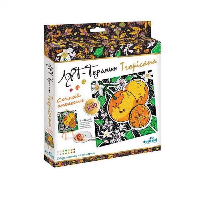 Коллекция алмазных узоров "Арт-терапия" Tropicana погружает в мир творчества. Выкладывайте алмазами Свежий киви, Сочный апельсин или Спелый гранат! Создавайте панораму из 3 картин. Оригинальное украшение интерьера. Алмазные картины сравнительно просты в изготовлении. Необходимо снять защитный слой с клеевой основы и с помощью карандаша-стилуса приклеивать стразы по номеру и цвету. Готовую картинку можно поставить на мольберт, который входит в набор. Блестящий результат восхищает всех! В наборе: картинка с клейкой основой (20х20 см), стенд, карандаш-стилус, тарелочка, стразы (1000+). Упаковка: коробка с подвесом