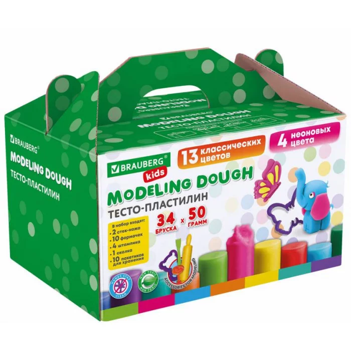 Пластилин-тесто для лепки BRAUBERG KIDS, 34 шт., 1700 г, 2 стека, 10 формочек, 4 штампика, 1 скалка, 10 пакетиков для хранения, 106723