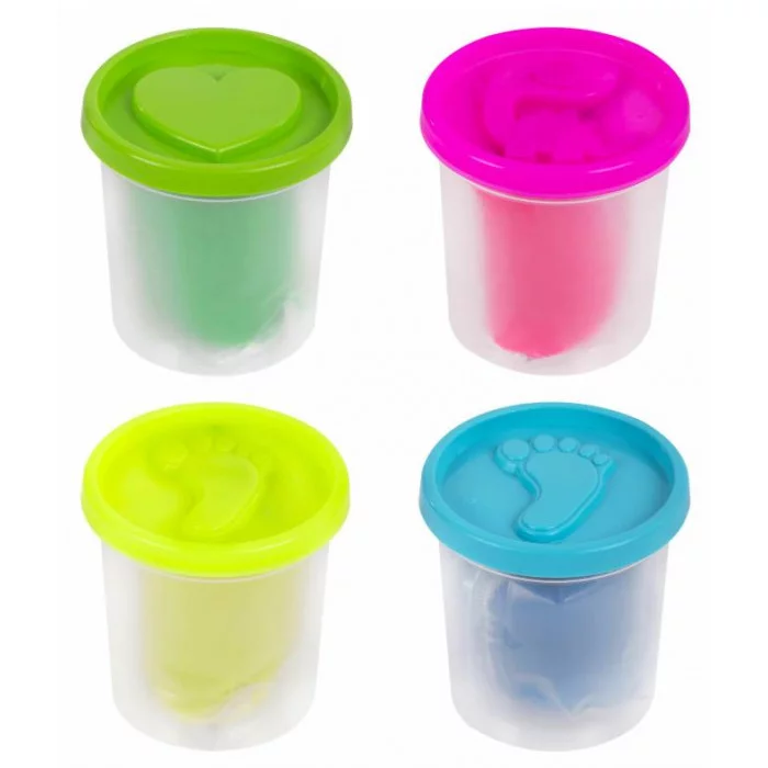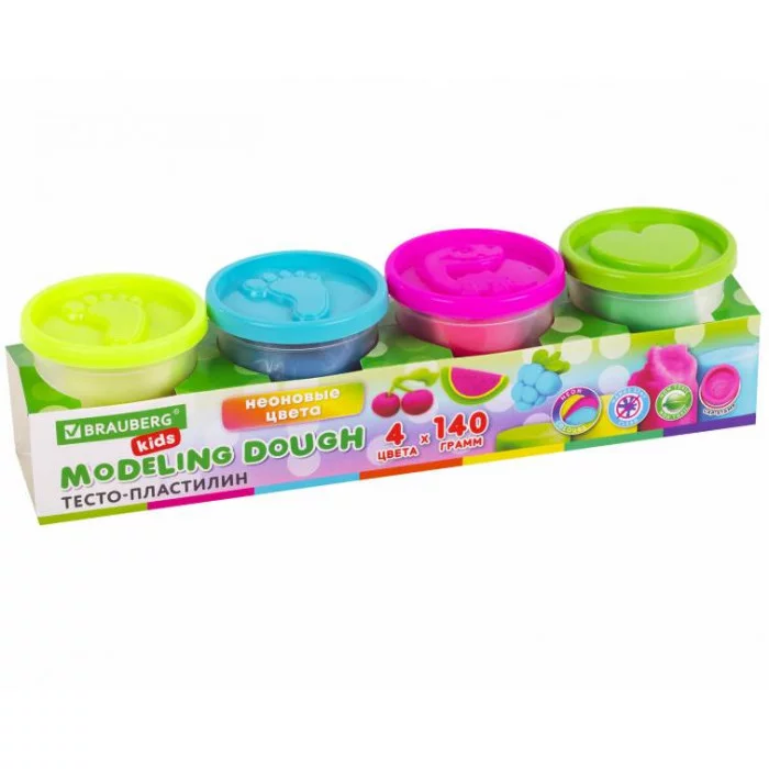 Пластилин-тесто для лепки BRAUBERG KIDS, 4 цвета, 560 г, яркие неоновые цвета, крышки-штампики, 106716