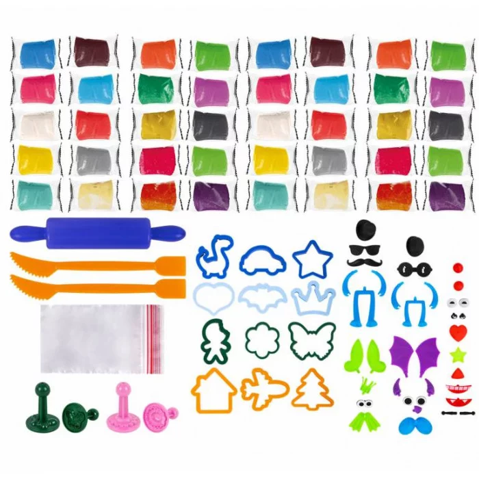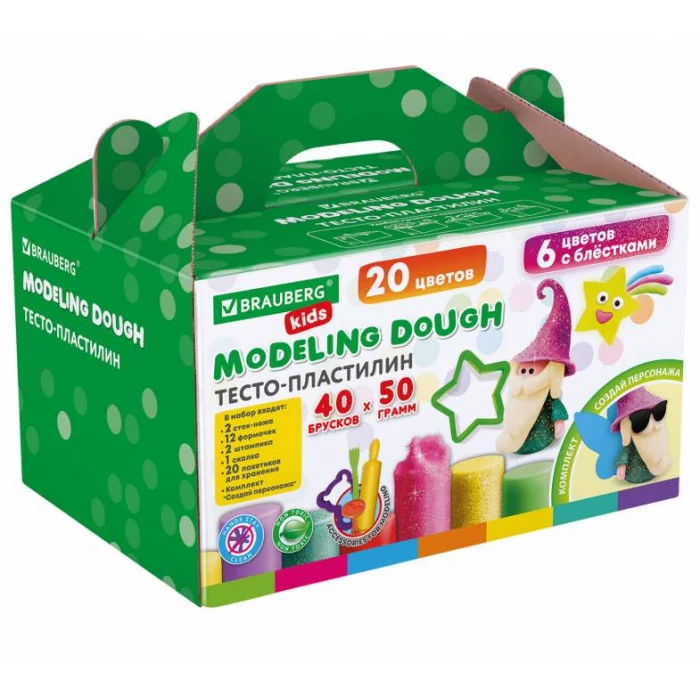 Пластилин-тесто для лепки BRAUBERG KIDS, 40 шт., 2000 г, 12 формочек, 2 стека, 2 штампика, 1 скалка, 20 пакетиков для хранения, 106724