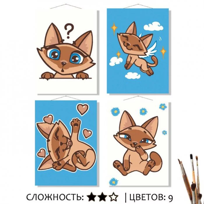Серия картин представляет собой холст раскраску с пронумерованными областями. Каждая краска в наборе имеет свой номер, соответствующий номеру области на холсте. Нужно аккуратно нанести необходимую краску на отмеченный для нее участок. Таким образом, шаг за шагом у вас получится великолепная картина. В набор входит: - Холст-раскраска на деревянном подрамнике с пронумерованными контурами (4шт.); - Три кисточки для рисования на основе нейлонового волокна; - Комплект безопасных, стойких к выцветанию акриловых красок в баночках по номерам; - Схема подсказка для раскраски живописи (так называемый контрольный лист – точная копия картины); - Набор креплений для фиксации готовой картины на стене.
