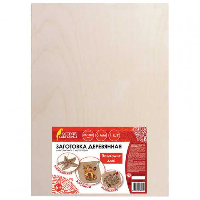 Заготовка деревянная ОСТРОВ СОКРОВИЩ - отличный инструмент для развития творческих способностей. Изделие отлично подходит для выжигания и росписи (на поверхность доски можно нанести красками любое изображение). Товар также подойдет для любителей декупажа. Заготовка прочная, не крошится и легко режется, а потому после проведения художественных работ можно придать изделию любую форму (рекомендуется обработать края лобзиком). Дощечка качественно отшлифована - роспись, выжигание и другие виды работ не доставят никаких хлопот даже начинающему художнику. В набор входит одно деревянное полотно размера А3 и толщиной 3 мм. Сортность фанеры - 1/1 - отличается светлым тоном заготовок и почти полным отсутствием дефектов на поверхности фанеры. Заготовка упакована в термоусадочную пленку, которая предохраняет ее от влаги. В такой упаковке заготовка не отсыреет, не деформируется и будет доставлена до адресата в целости и сохранности.Изделие относится к товарам средней ценовой категории. Срок годности не ограничен.Деревянная