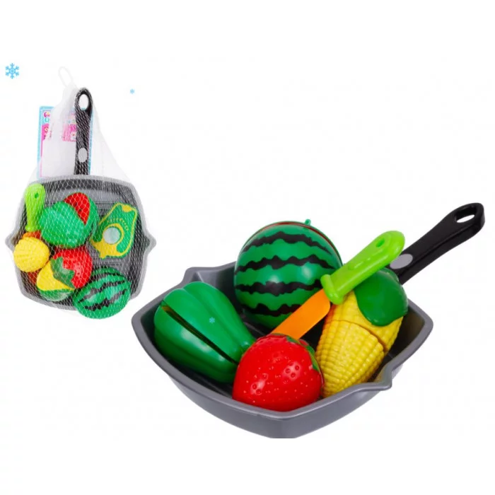 Когда настоящим ножом пользоваться еще рано, а для того, чтобы приготовить обед для игрушек, обязательно нужно нарезать овощи и фрукты, на помощь приходят наборы продуктов на липучках. Они выполнены из яркого и безопасного пластика. Липучка соединяет две половинки початка кукурузы, морковки, клубники, маленького арбузика и сладкого перца. В наборе также безопасный пластиковый нож и специальная сковородка-гриль.