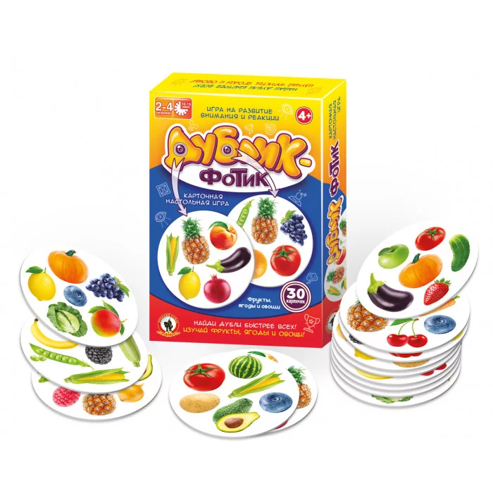 «Дублик» - это игра, которая сможет развеселить и увлечь каждого! В комплекте карточки с разным набором картинок. Игрокам необходимо найти совпадающие изображения быстрее всех. В процессе игры участники изучат какие бывают фрукты, ягоды и овощи, а поможет в этом буклет-подсказка. В правилах вы найдете несколько вариантов игры. Память, скорость и внимание - Ваши главные помощники. Вперёд за победой! Игра подойдет для 2-4 игроков. В комплект игры входит 30 карт и правила игры.