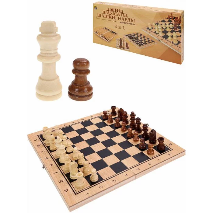 Классическая игра 3 в 1: шахматы, нарды, шашки. Шахматы - настольная игра, предназначенная как для детей в возрасте от 6 лет, так и для взрослых. Подобные игры развивают у детей внимательность, наблюдательность, память, мелкую моторику рук и пальцев. Взрослым подобный игровой процесс помогает отвлечься от будней, сосредоточиться на решении непростых логических задач, развивает стратегическое мышление. Игра в нарды также поспособствует развитию стратегического мышления и пространственного воображения, улучшит память и математические способности, научит концентрироваться. Шахматное поле и фигуры выполнены из дерева. Размер поля 29х14.5х3 см. Размеры фигур: король 5,4 см, пешка 2,7*1,5 см. Также в наборе есть деревянное поле для игры в нарды и фишки к нему, кубики и шашки.
