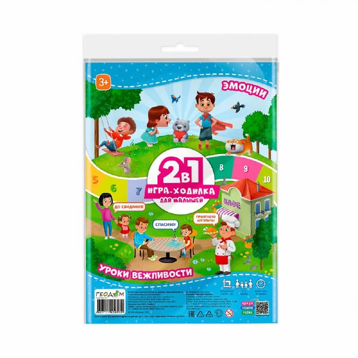 Игра-ходилка с фишками для малышей 2в1. «Эмоции+Уроки вежливости» -с одной стороны знакомит малышей с различными эмоциями, которые ребёнок испытывает каждый день в своей жизни. А обратная сторона "Уроки вежливости" демонстрирует ребёнку примеры ситуаций, в которых он может использовать то или иное вежливое слово.
