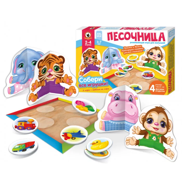 Малыш с удовольствием посадит героев вокруг песочницы и поможет правильно распределить игрушки. Объемные фигурки хорошо стоят на столе и могут быть задействованы и в других играх ребёнка.