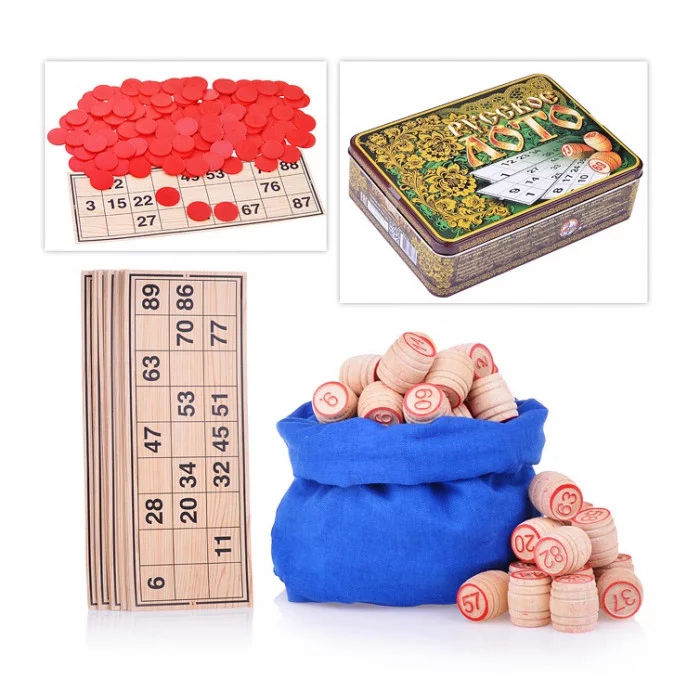 Русское лото «Русские узоры» — популярная настольная игра, известная многим с детства. Правила не менялись с момента её появления в XVI веке. Каждый из участников получает по одной или несколько карточек с 15 случайными числами. Ведущий достаёт из мешка бочонки с номерами и озвучивает их. Игроки ищут соответствующие числа на своих карточках и кладут на них фишки. Победителем становится участник, который быстрее всех закроет все номера. Для кого? Для участников старше 8 лет. В комплект входит 24 игровых карточки; 90 деревянных бочонков с номерами; 150 жетонов; мешок для бочонков; мешок для жетонов; правила.