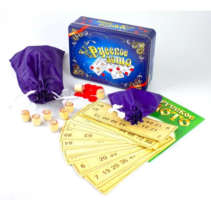 Русское лото в жестяной коробке. Оно привлекает к себе внимание и может послужить отличным недорогим сувениром или подарком для друзей и близких. В этой жестяной коробке-ларце вас ждет настоящая русская игра с присущими ей русскими традициями. Правила игры остались неизменны, изменилось качество бочонков, которые мы стали производить на новейшем оборудовании. В плотном ситцевом мешочке вы найдете 90 березовых бочонков диаметром в «пузе» 23 мм высотой 24 мм, 24 карточки из плотного картона и 150 дополнительных жетонов. Уже много веков игра Русское лото собирает вокруг себя огромное количество любителей провести вечера с деревянными бочонками в руках и в доброй компании.