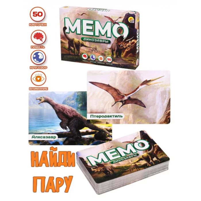 Мемо - одна из любимых детских игр. Легкие правила и красивые красочные картинки непременно заинтересуют ребенка, а все полезные навыки усвоят в игровой форме, что очень важно в развитии ребенка. Игра развивает внимательность, наблюдательность и память, а красочные картинки, поднимут настроение всем игрокам. В наборе 50 карт.