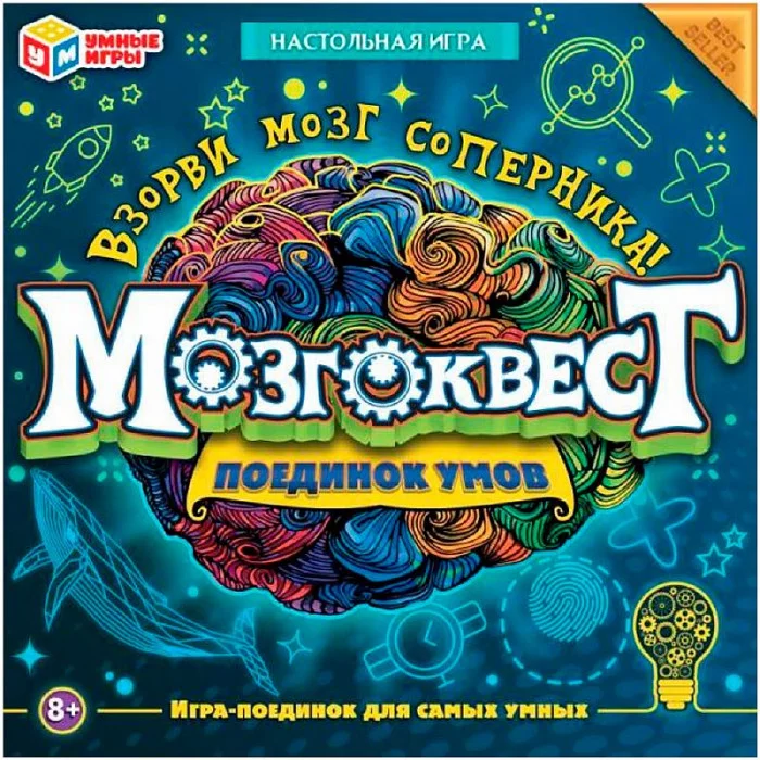 Взорвите мозг соперникам в увлекательной игре-поединке «Мозгоквест. Поединок умов»! Это настоящий мозговой штурм, став участниками которого, вам придётся напрячь ум, память и сообразительность. Игрокам предстоит выполнять задания восьми типов, соревнуясь на скорость с соперниками по игре, чтобы собрать все жетоны и одержать победу.